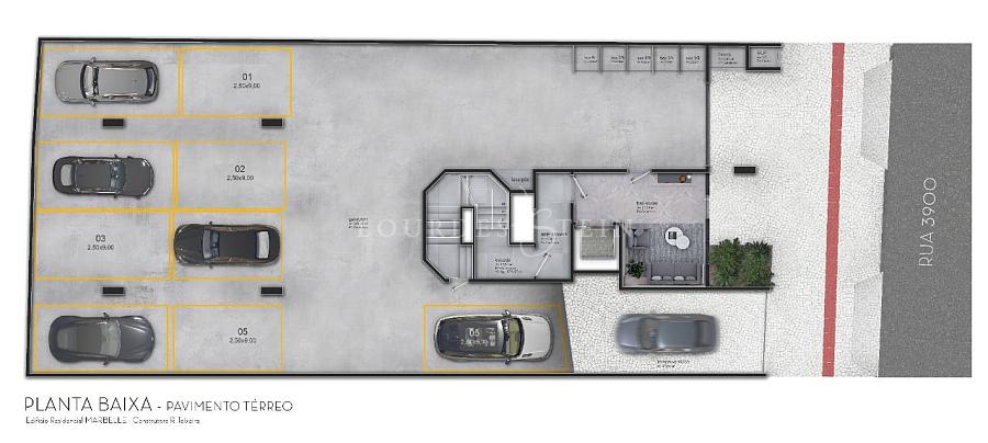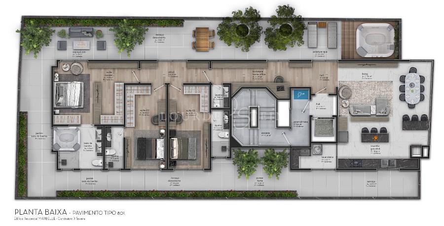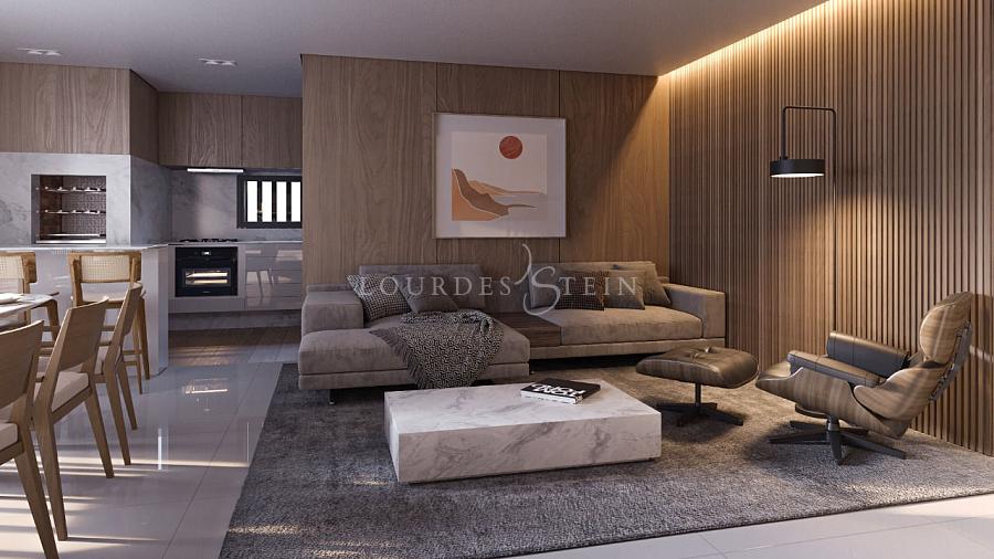 Planta cuidadosamente distribuída em 3 suítes, closet, lavabo, living, sala de estar, cozinha, churrasqueira à carvão, área de serviço.