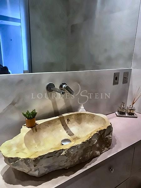 Banheiro moderno: porcelanato de grandes formatos, pia em pedra balinesa e box em vidro.
